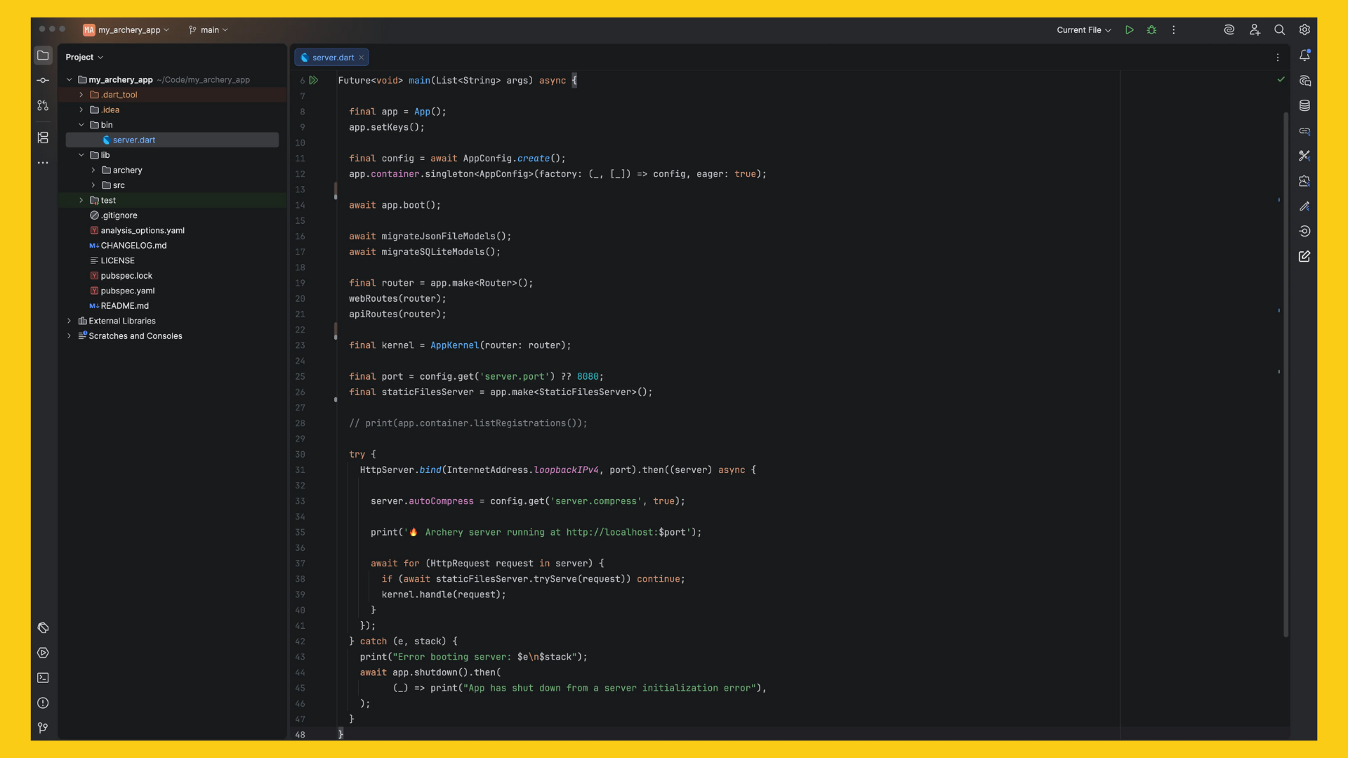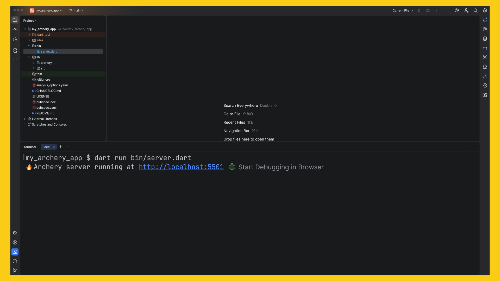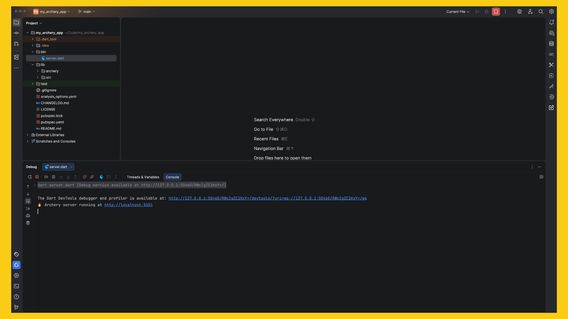 Run this terminal command from your project root or use the debug tool in your IDE to run bin/server.dart